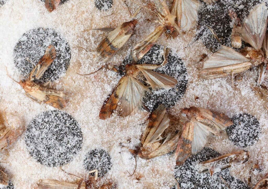 Pheromon-Mottenfallen locken männliche Motten mit einem synthetischen Duft an, der die Sexualpheromone der Weibchen imitiert. Die Männchen kleben an der Klebefläche fest und können nicht mehr wegfliegen.