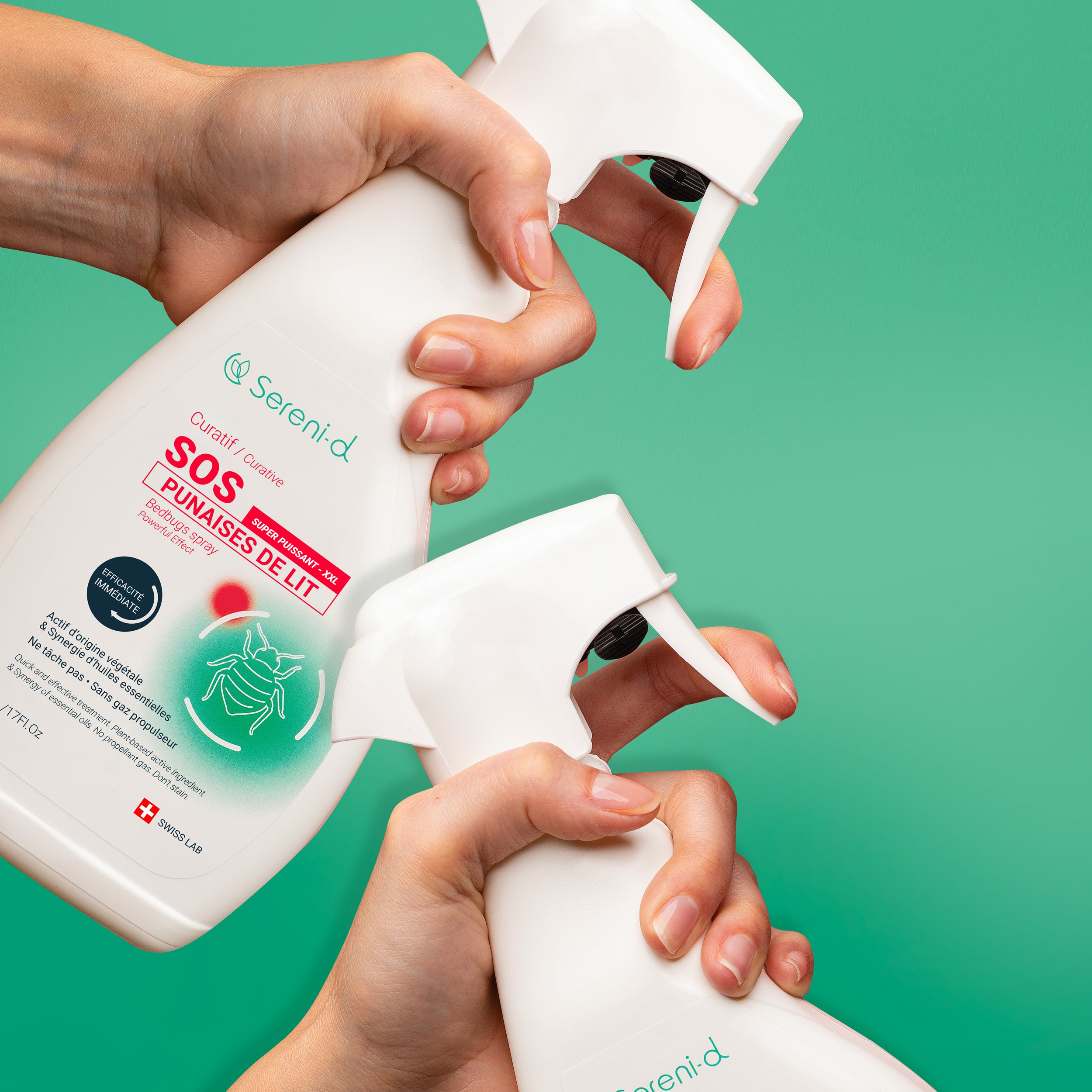 El spray antichinches SERENI-D SOS debe utilizarse en caso de infestación de chinches o a la menor sospecha de presencia de chinches para particulares y profesionales. Pulverizado sobre la ropa de cama y los escondites, el spray destruye las chinches en todas sus fases de desarrollo (huevo, larva, adulto) de forma inmediata (en los 30 minutos siguientes a un disparo directo o después de que una chinche haya pasado por la zona tratada) actuando sobre su sistema nervioso y su exoesqueleto. El tratamiento combinado con medidas mecánicas debe repetirse en el plazo de una semana y después cada 2 o 4 semanas tras la desaparición de los chinches.