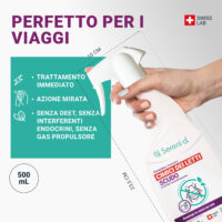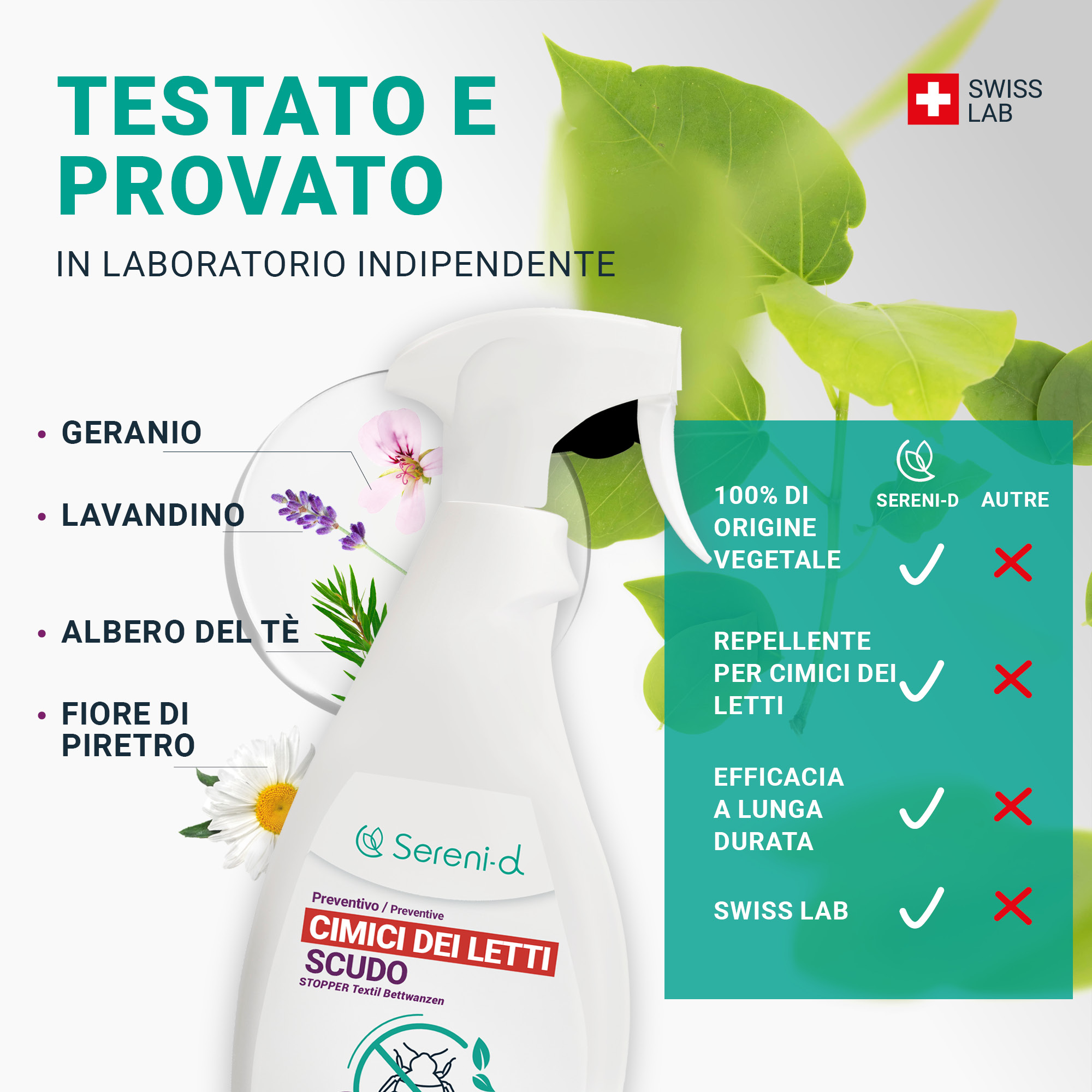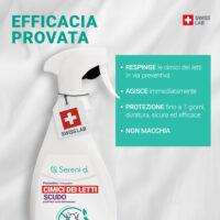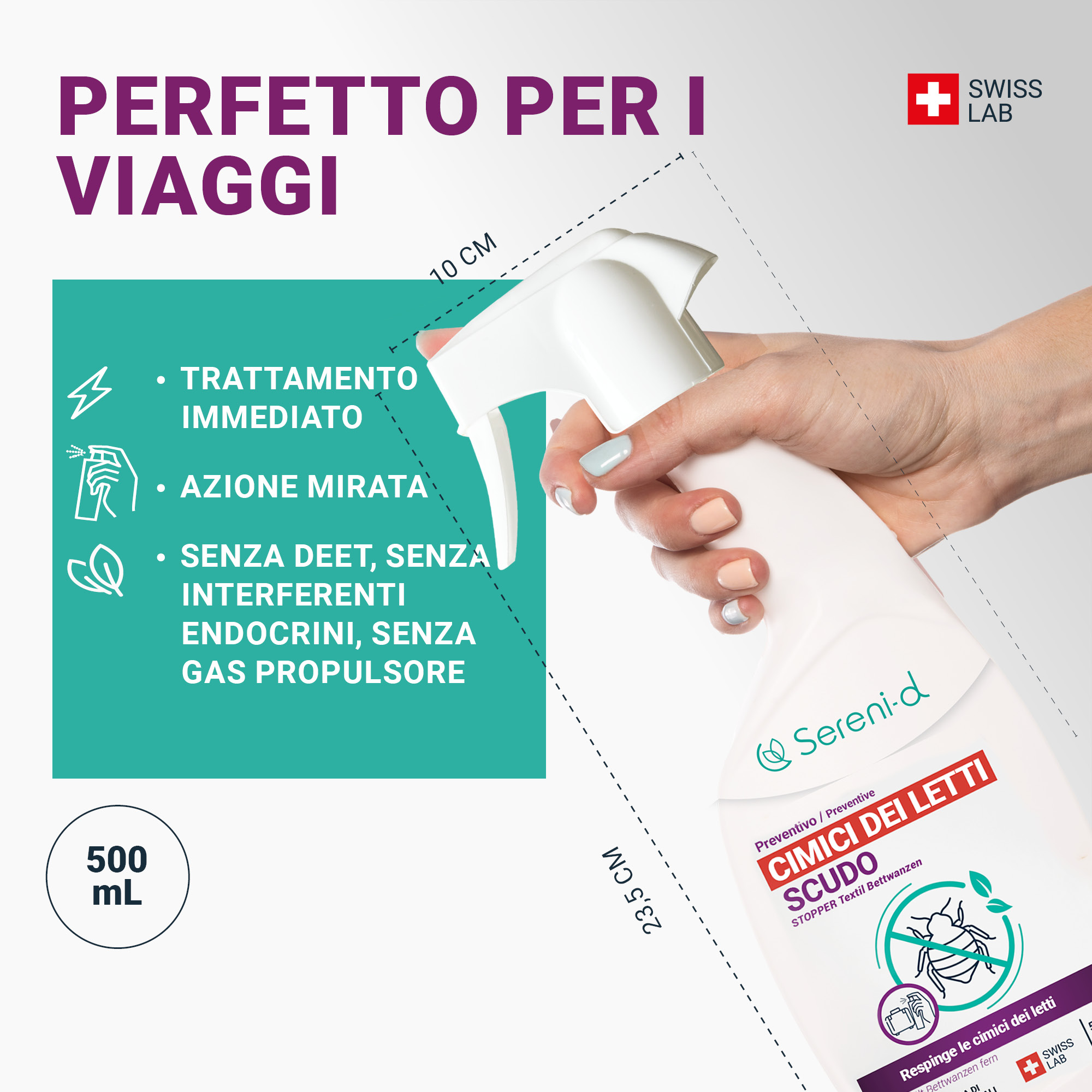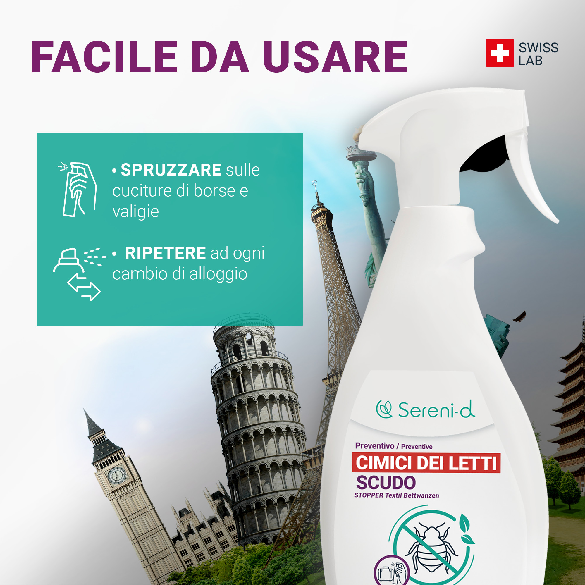 Lo spray può essere applicato anche su superfici come soglie di porte, telai di finestre o prese d’aria in caso di sospetto di ambienti vicini potenzialmente infestati. SCUDO di Sereni-d® è il tuo miglior alleato durante i viaggi o in caso di sospetto di infestazioni vicine.