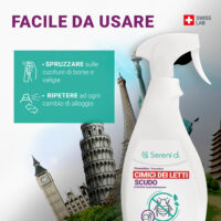 Lo spray SERENI-D SOS anti-cimici da letto deve essere utilizzato in caso di infestazione da cimici da letto o al minimo sospetto di presenza di cimici da letto da privati e professionisti. Spruzzato sulla biancheria da letto e sui nascondigli, lo spray distrugge le cimici da letto in tutti i loro stadi di sviluppo (uova, larve, adulti) immediatamente (entro 30 minuti dall’applicazione diretta o dopo che una cimice da letto è passata sull’area trattata) agendo sul loro sistema nervoso e sull’esoscheletro. Il trattamento combinato con misure meccaniche deve essere ripetuto dopo una settimana e poi ogni 2-4 settimane una volta che l’infestazione è scomparsa.