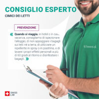 - Seguire le buone pratiche di prevenzione “meccanica” delle cimici da letto: Compartimentare i tessuti nel bagaglio quando si viaggia; non appoggiare le valigie sui letti, ma in alto, su portabagagli o tavoli; ispezionate la biancheria da letto quando vi trasferite in una nuova casa; controllate bene i vostri effetti personali al vostro rientro, all’aperto o in bagno se avete dei dubbi, e lavate i tessuti ad alte temperature o congelateli.