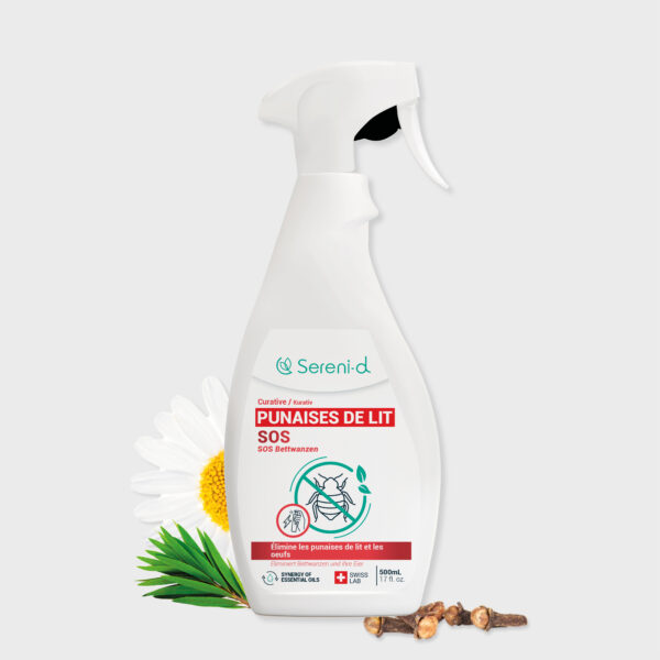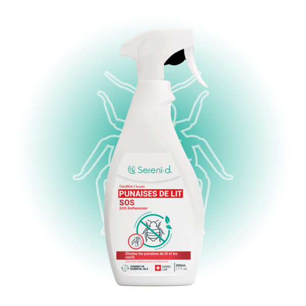 Le spray SERENI-D SOS Anti-Punaises de lit est quant à lui à utiliser en cas d’infestation de punaises de lit, ou au moindre doute de présence de punaises de lit pour les particuliers et professionnels. Vaporisé sur les literies et cachettes, le spray détruira les punaises de lit à tous leurs stades de développement (oeuf, larve, adulte) de façon immédiate (dans les 30minutes après un tir direct ou après le passage d’une punaise de lit sur la zone traitée) en agissant sur leurs systèmes nerveux et exosquelettes. Le traitement associé aux mesures mécaniques est à renouveler dans la semaine puis toutes les 2 à 4 semaines après disparition.